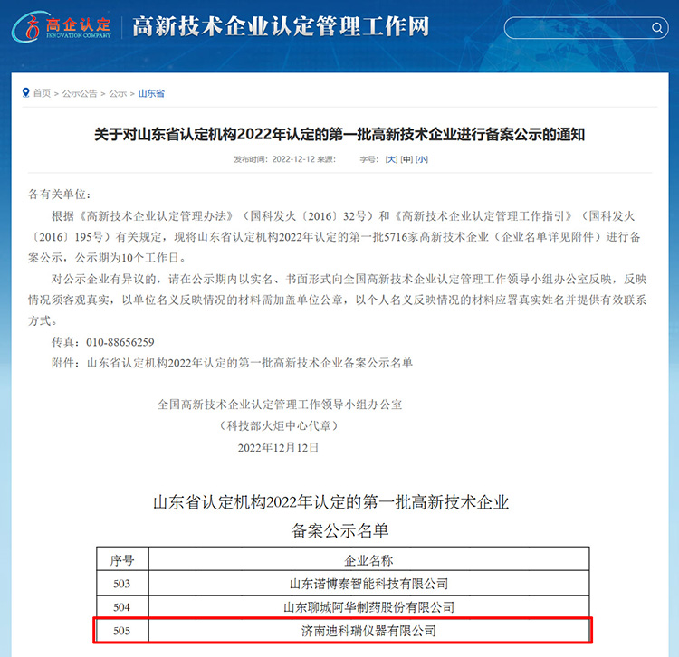 近日,根據(jù)《高新技術(shù)企業(yè)認(rèn)定管理辦法》和《高新技術(shù)企業(yè)認(rèn)定管理工作指引》有關(guān)規(guī)定,經(jīng)公司申報(bào)、地方初審、專家審查等嚴(yán)格的評(píng)審程序,濟(jì)南迪科瑞儀器順利通過(guò)2022年山東省第一批“國(guó)家高新技術(shù)企業(yè)”認(rèn)定。